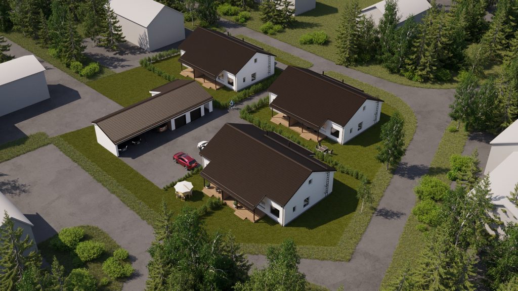Asunto Oy Jyväskylän Voittola koostuu kolmesta paritalosta ja yhdestä talousrakennuksesta.
