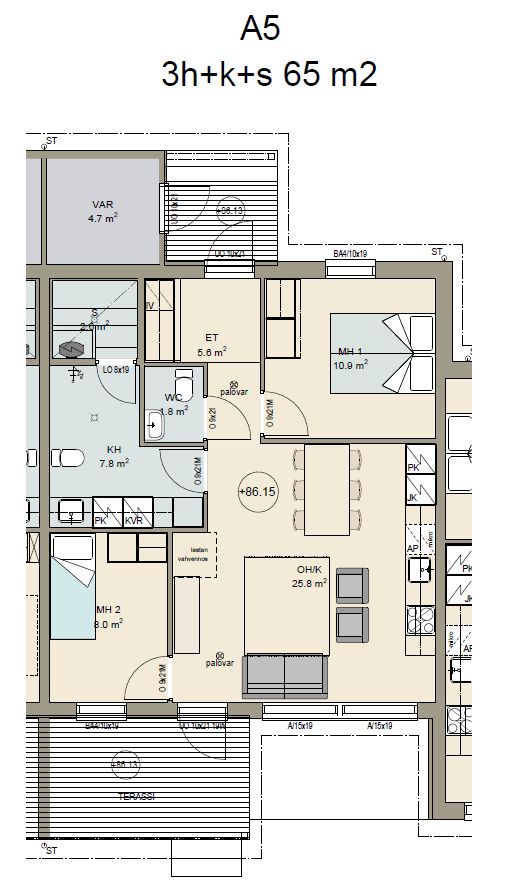 4,7 m2 puolilämmin varasto, pääoven vieressä.